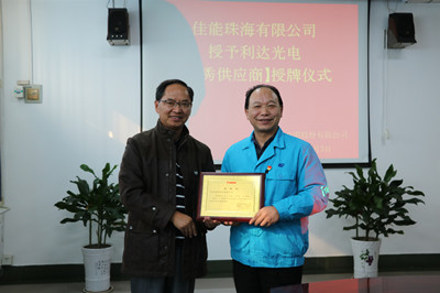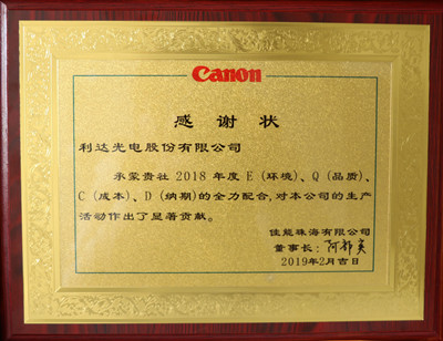 利達光電榮獲佳能珠海有限公司2018年度優(yōu)秀供應商